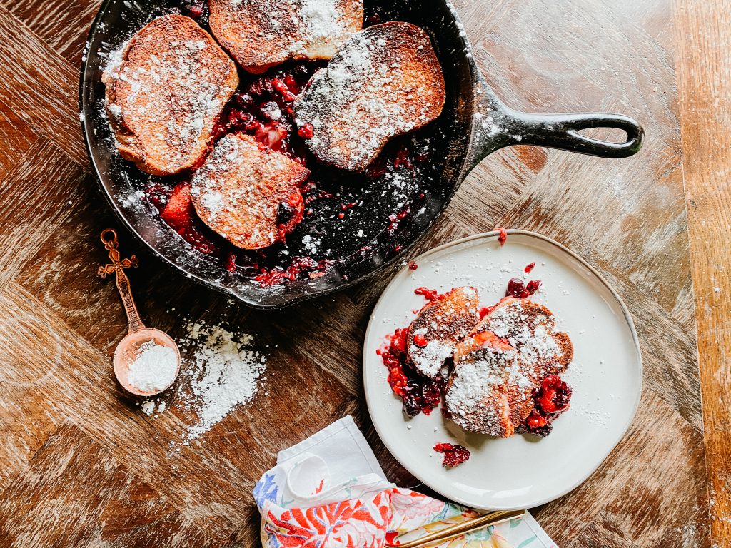 Throw a package of frozen berries in the bottom of your cast iron, topped with 1 tbsp flour, sprinkled with brown sugar and cinnamon. It will not look completely full – but trust me you don’t want the fruit overpowering the tastiness of the french toast.