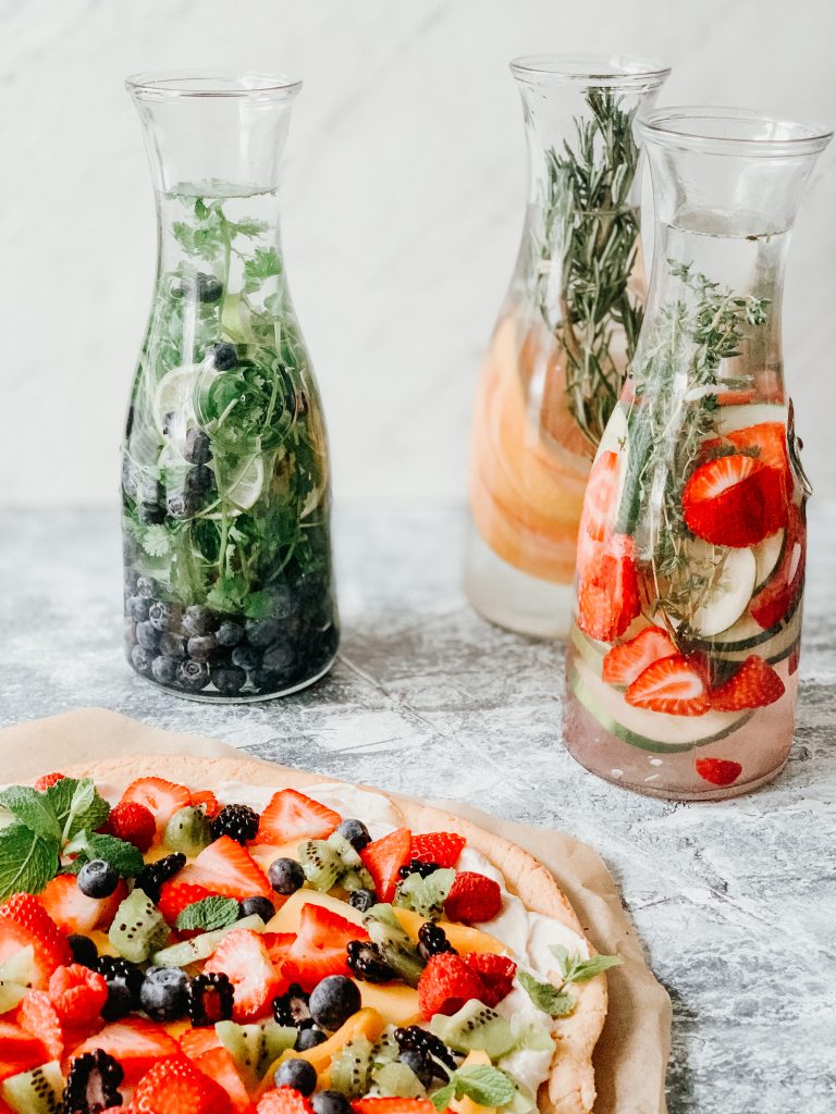 I like putting herbs in my fruit water as well! These different combinations make water super flavorful and refreshing for the summer and pair nicely with this Fruit Pizza.