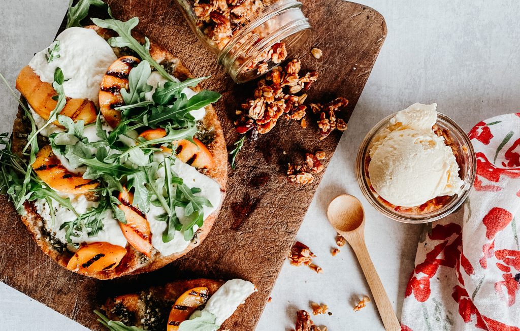 This Peaches, Pesto and Burrata Flatbread is easy and comes together in minutes. It is a perfect way to celebrate the summer, make dinner with your kids, or enjoy a nice treat with friends!