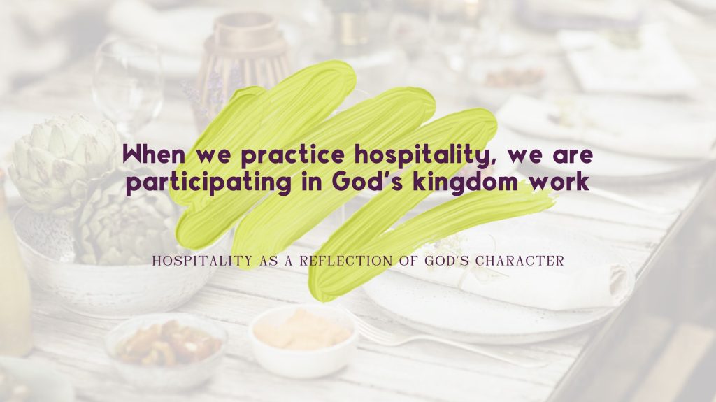 - Generosity: God’s love is extravagant, going beyond what we deserve. Romans 5:8 (NLT) tells us, “But God showed his great love for us by sending Christ to die for us while we were still sinners.” Hospitality gives us the opportunity to be generous, not just with our material possessions but also with our time, attention, and care.