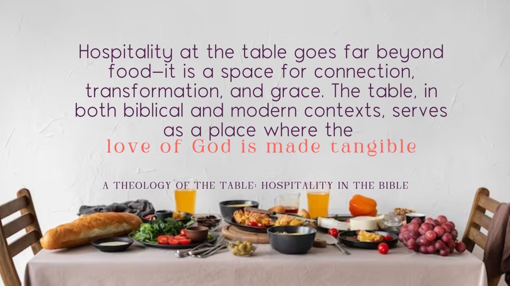 Why is this? What is it about sharing a meal that makes it sacred? Hospitality at the table goes far beyond food—it is a space for connection, transformation, and grace. The table, in both biblical and modern contexts, serves as a place where the love of God is made tangible.