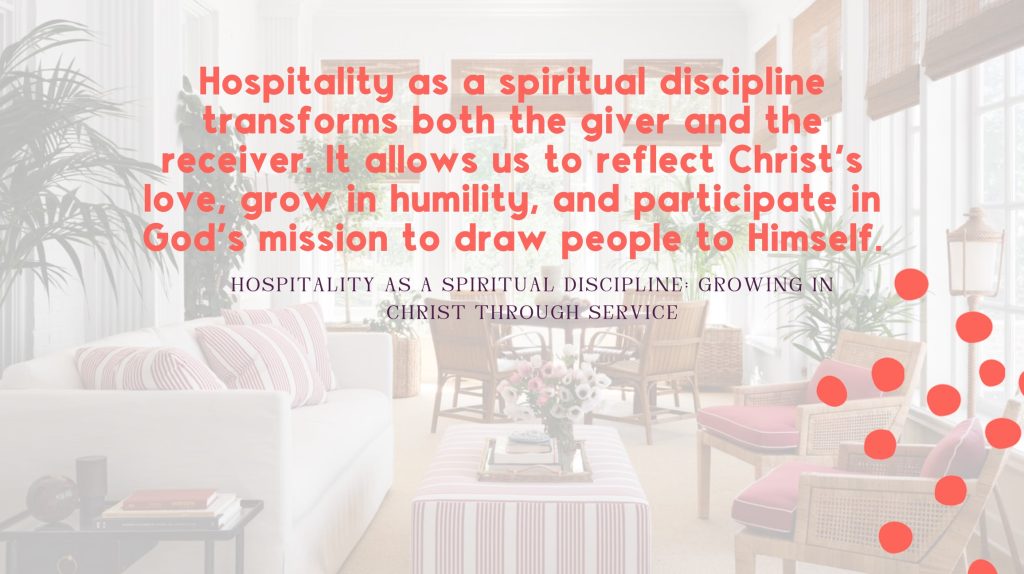 Hospitality as a spiritual discipline transforms both the giver and the receiver. It allows us to reflect Christ’s love, grow in humility, and participate in God’s mission to draw people to Himself.