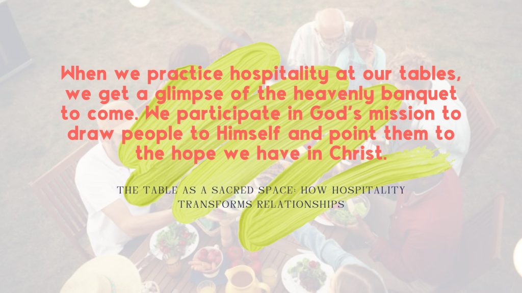 When we practice hospitality at our tables, we get a glimpse of the heavenly banquet to come. We participate in God’s mission to draw people to Himself and point them to the hope we have in Christ.
